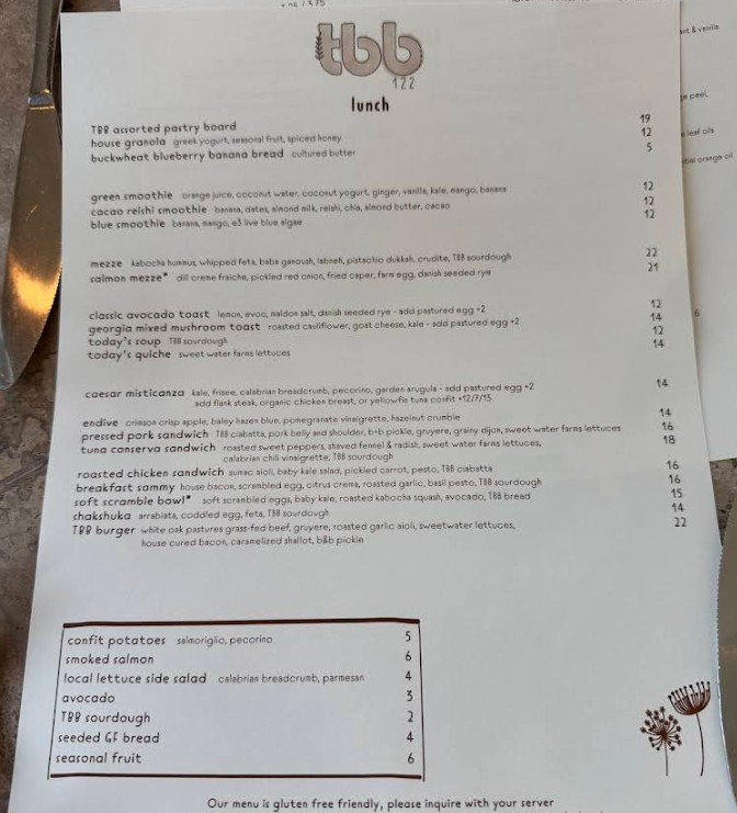 LOVED this place! TBB 122, farm-to-table restaurant, also serves lunch and dinner! Housed in what looks like a charmingly converted home, the restaurant has a warm, airy, and inviting vibe. It’s tucked away in a residential area, just off the main road, and even has some cozy outdoor seating. The entrance is around the back, and as soon as you walk in, you’re greeted by a display of fresh-baked pastries, including their signature cinnamon bun (don’t miss it!). We came early on a Thursday morning for an 8:30 AM reservation—four adults and one toddler—and had no trouble getting seated. The staff was incredibly accommodating, giving us a spacious table perfect for our little one. Three of us ordered the TBB Breakfast: eggs, in-house bacon, avocado slices and seasoned fingerling potatoes—all cooked to perfection. We also shared the warm cinnamon bun, which was absolutely delicious (no icing necessary), and I had a latte made with organic milk. Every bite and sip was fresh, flavorful, and clearly made with care. Highly recommend TBB 122—can’t wait to come back and try their lunch or dinner next time!
